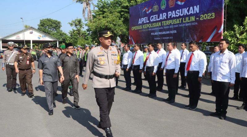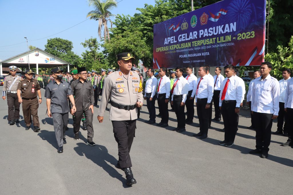 Polresta Pasuruan – Kapolres Pasuruan Kota AKBP Makung Ismoyo Jati, S.I.K., M.I.K pimpin apel gelar pasukan sebagai bagian dari persiapan Operasi Lilin Semeru 2023. Apel ini melibatkan personel dari berbagai satuan di wilayah hukum Polres Pasuruan Kota untuk meningkatkan kewaspadaan dan kesiapan dalam menghadapi momen Natal dan Tahun Baru. Kamis(21/12/2023).