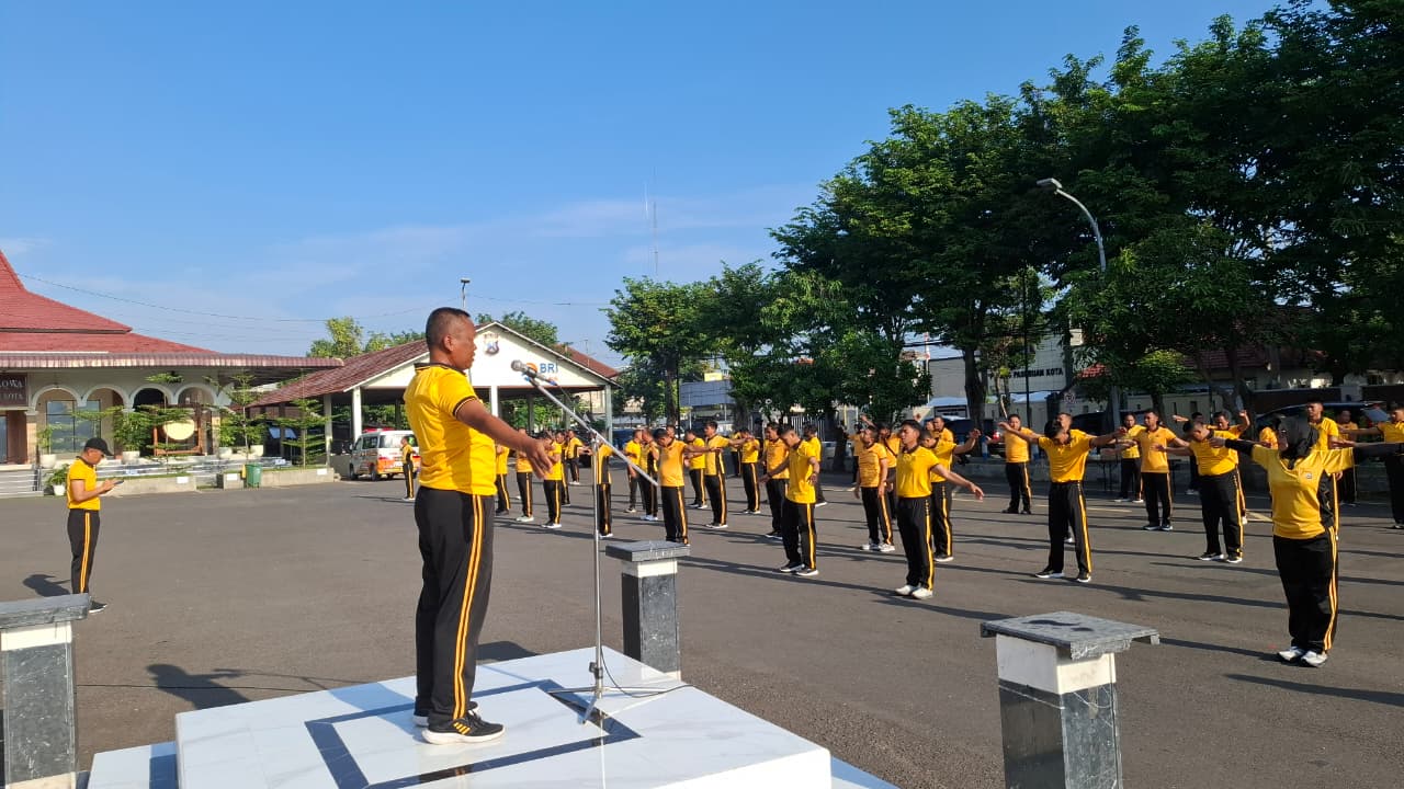 Usai apel pagi, kegiatan dilanjutkan dengan olahraga senam bersama yang diikuti seluruh personel dengan penuh semangat. Senam bersama tersebut bertujuan untuk melatih kebugaran jasmani, meningkatkan daya tahan tubuh, serta menjaga stamina agar tetap prima dalam menjalankan tugas sehari-hari.