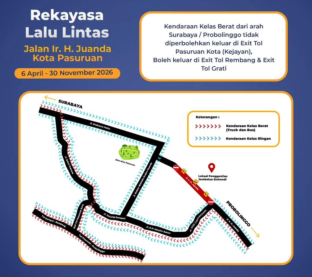 Kebijakan ini dilakukan sebagai dampak dari pembongkaran Jembatan Bok Wedi yang terletak di Jalan Raya Ir H Juanda, Kelurahan Blandongan, Kecamatan Bugulkidul, Kota Pasuruan, menjadi akses vital bagi masyarakat.